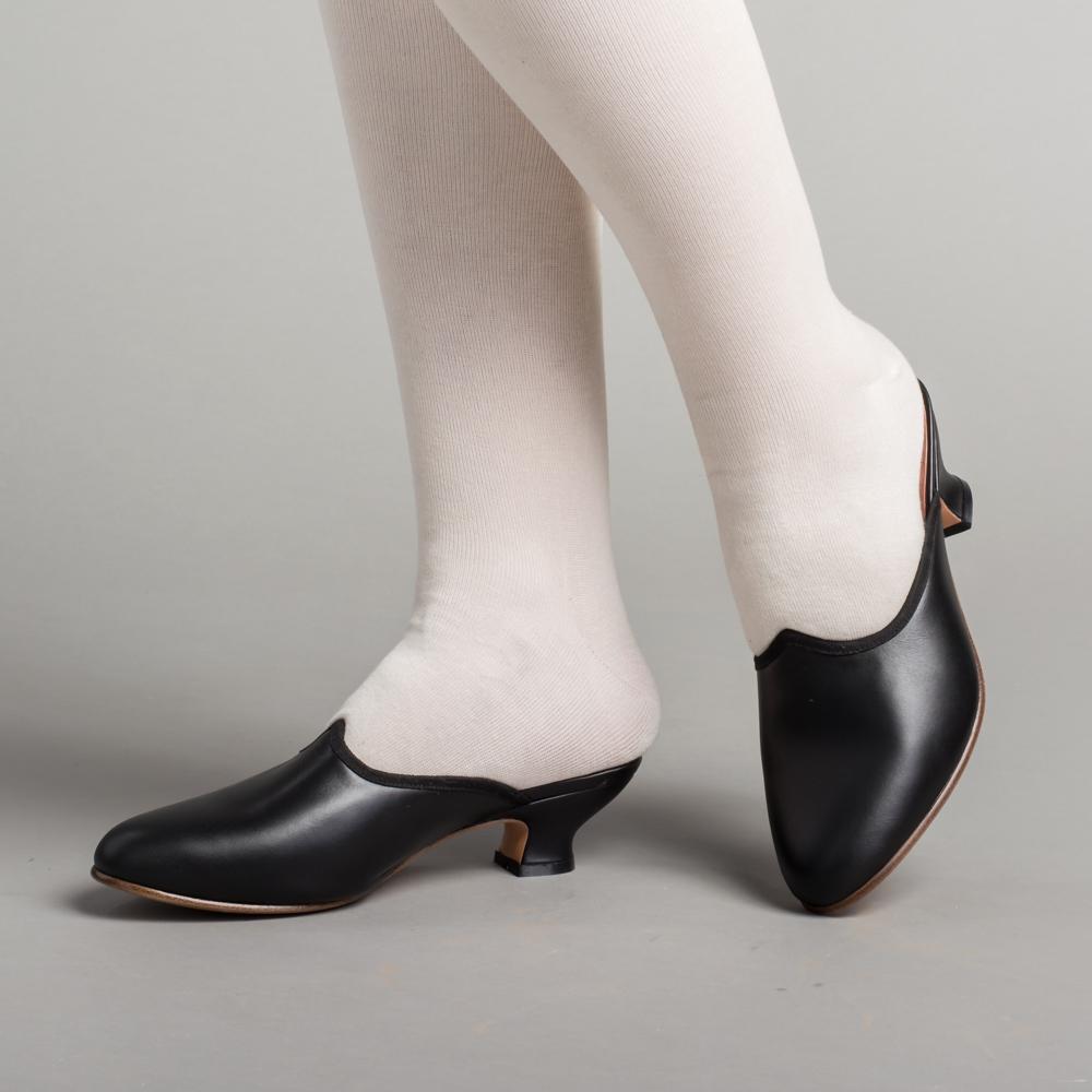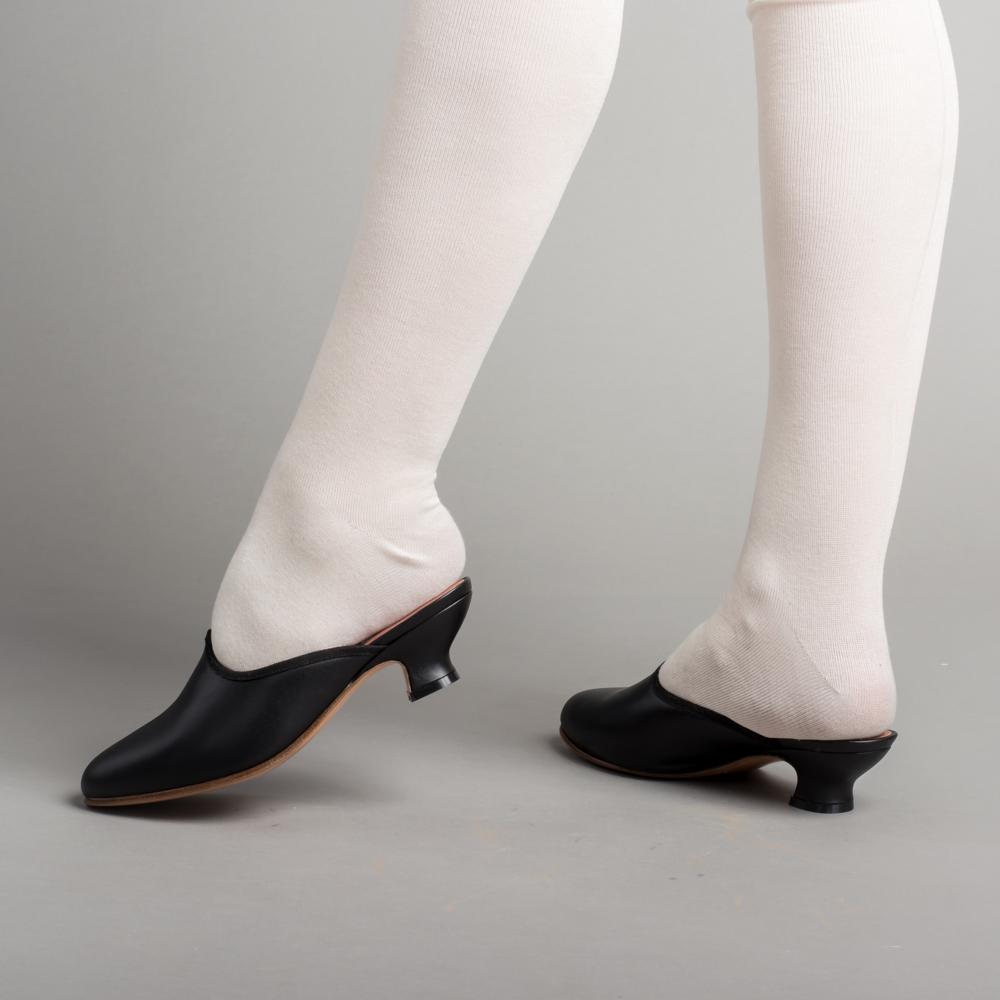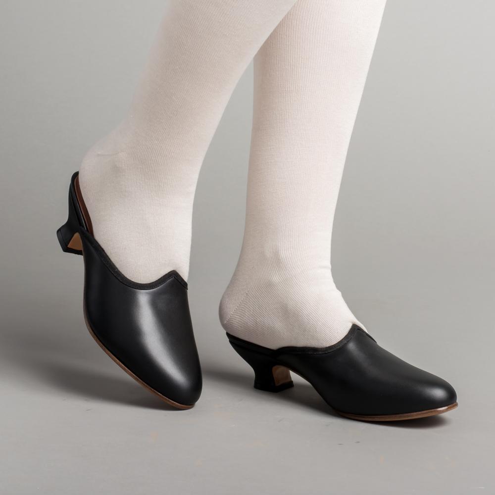 Sophie 18th century mules are the perfect slippers for your Georgian-era impressions. Correct for c. 1760s - 1790s, these adorable little backless mules work wonderfully for both working and upper class, with short 1.75" / 4.45 cm French heel, a shaped vamp, and softly tapered toe.