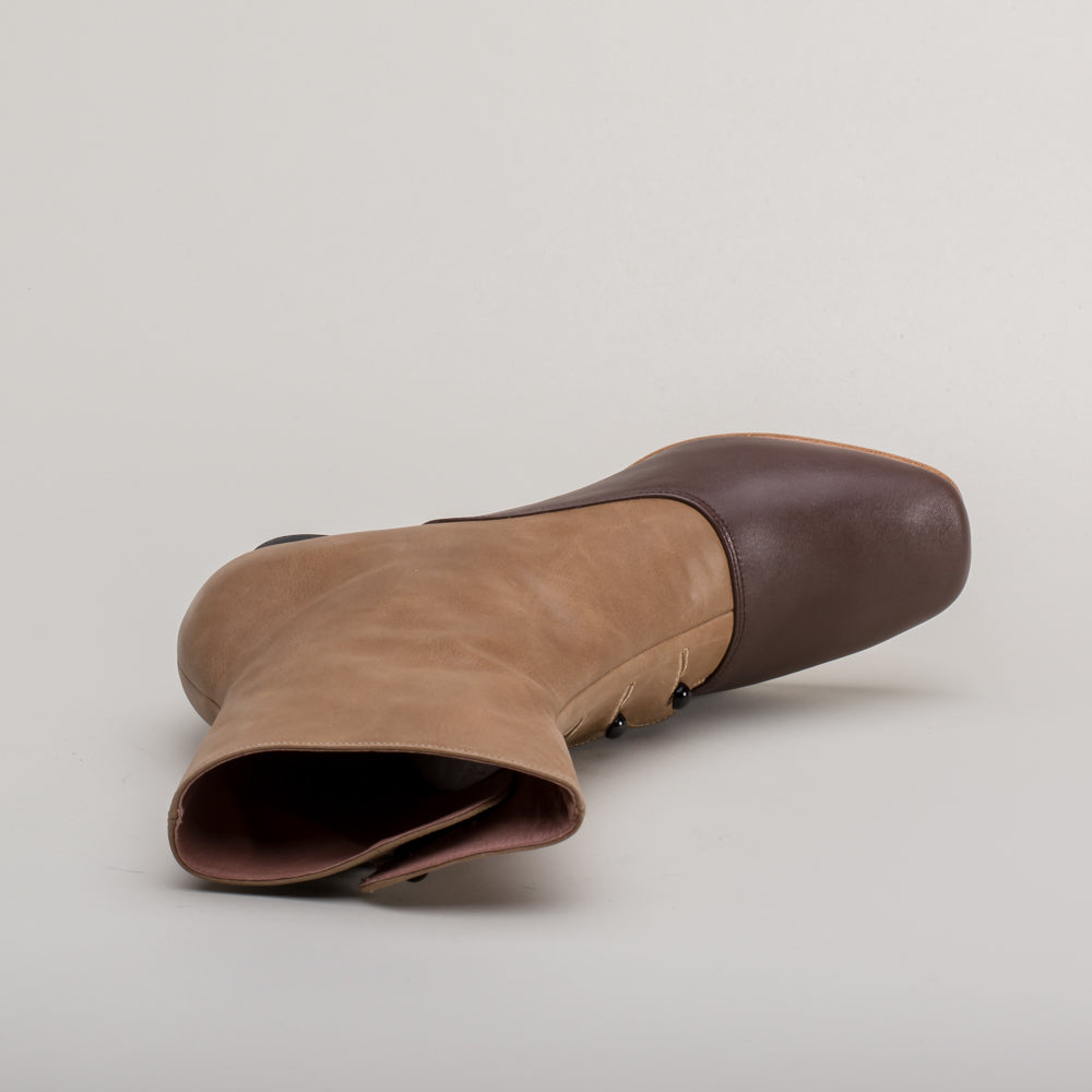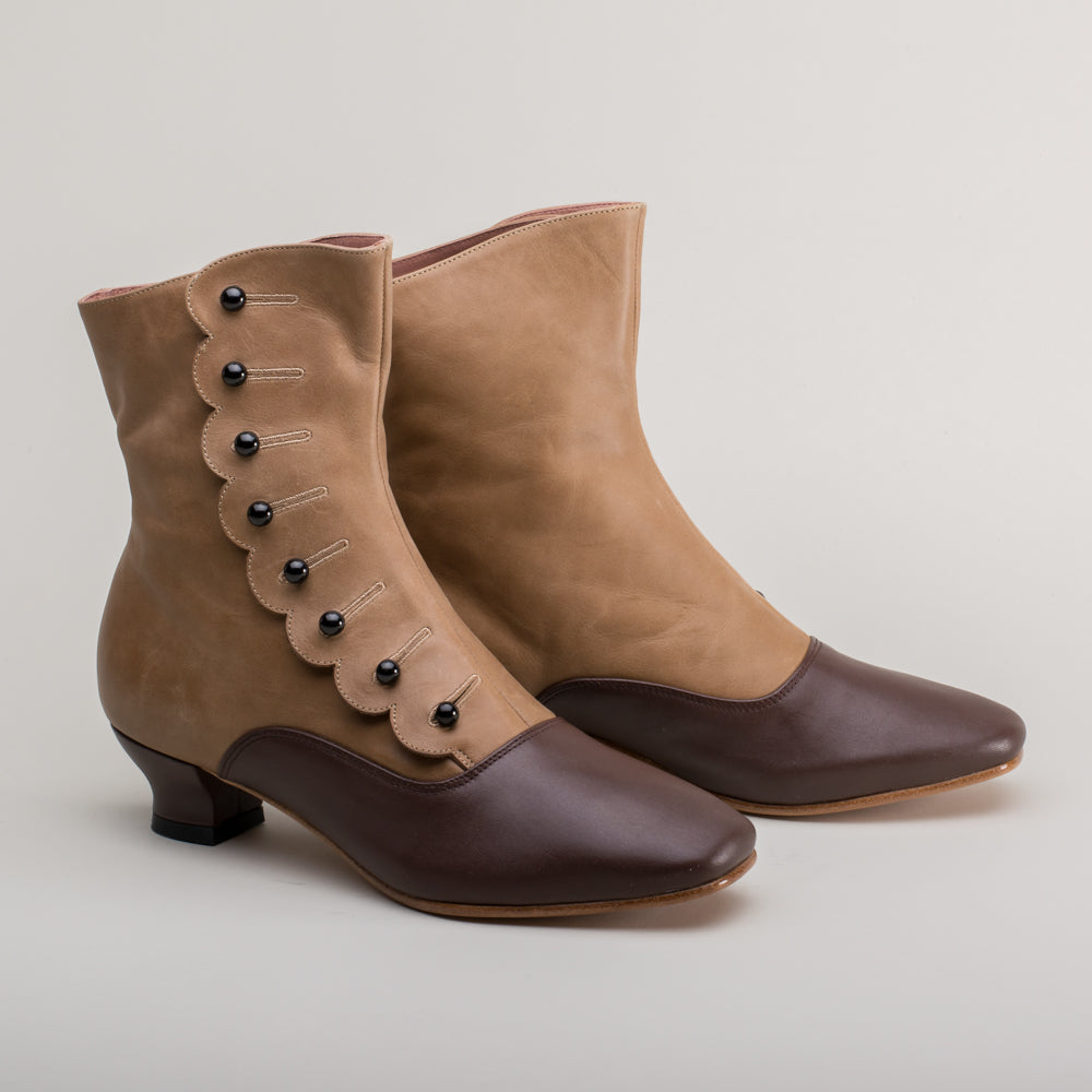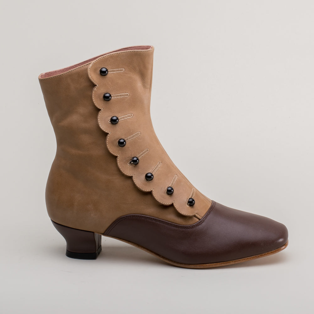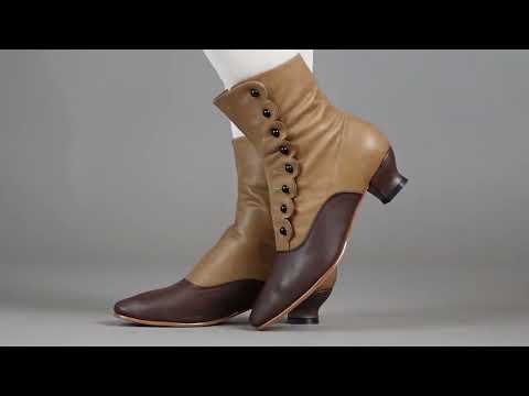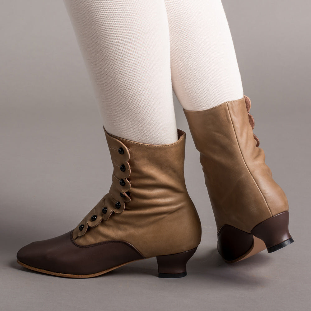 These mid-Victorian and Bustle Era boots have square toes, a short heel molded from an original, and an attractive scalloped edge and top, making them practical yet feminine, and ideal for a fashionable Victorian lady.