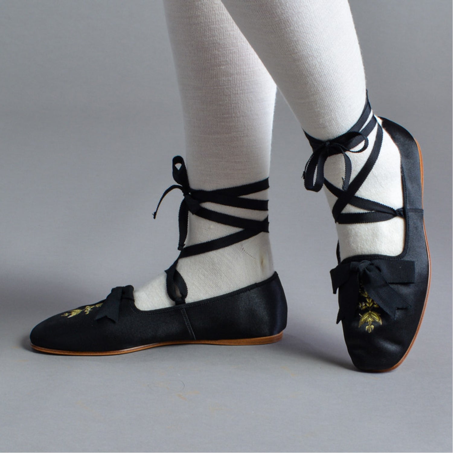 Bring your Regency dreams to life with the perfect pair of delicate dancing slippers. The Penelope slippers offer beauty, comfort, and versatility with so many color pairings, ways to wear the ribbons, and a soft yet durable construction.