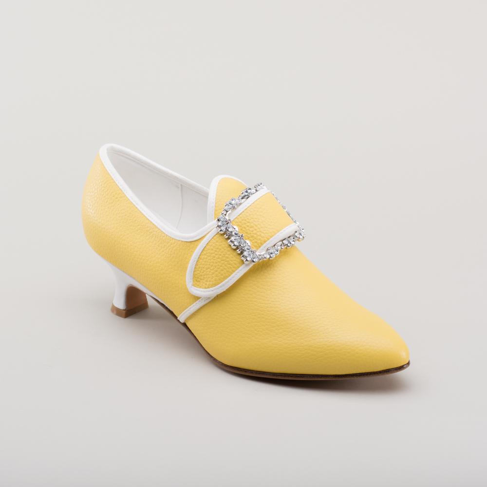Dunmore 18th century shoes trimmed in white are the ideal materials, silhouette, and heel to pair with your late 18th-century gown, from the Revolutionary War to the French Revolution.