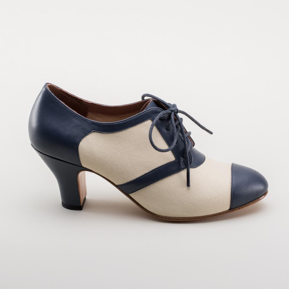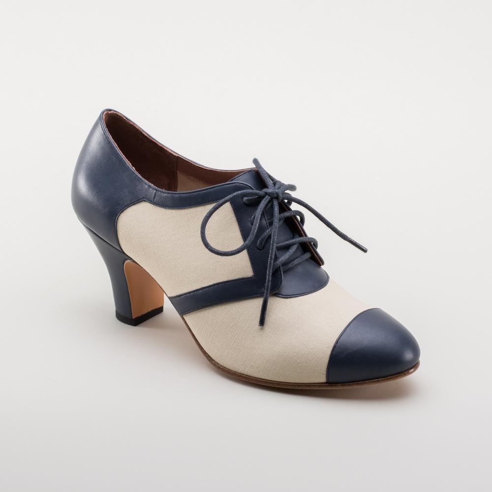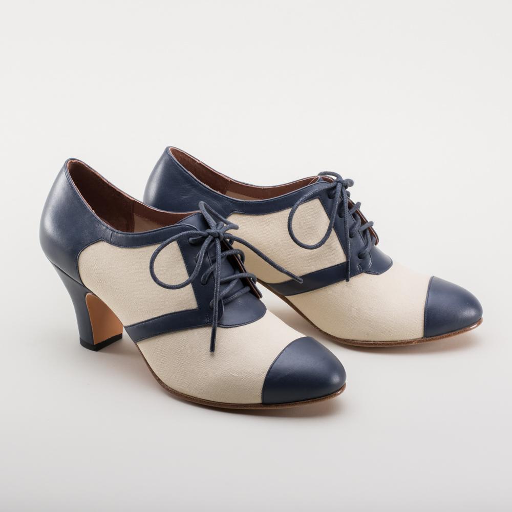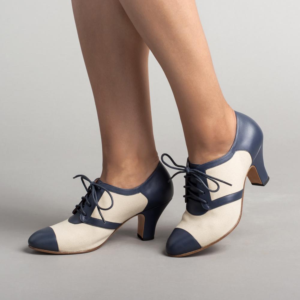 How better to complete a 1920s or 1930s sporty ensemble than with a perfect pair of Evelyn oxfords? These retro spectator oxfords are made of tan canvas combined with a rich brown leather on a 2 3/8" / 6 cm Spanish heel and insole arch support.