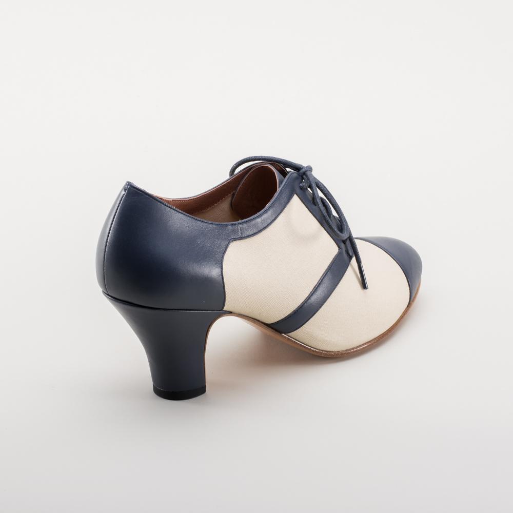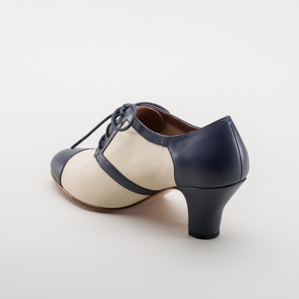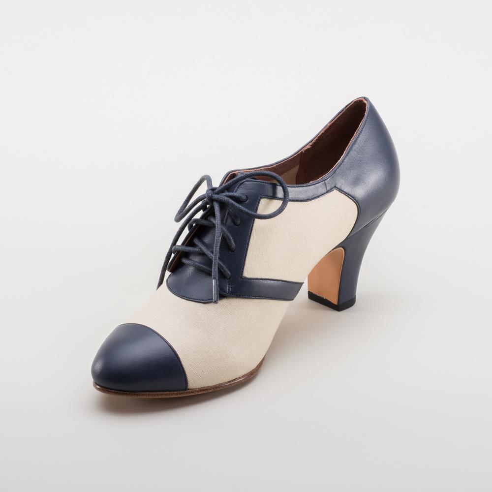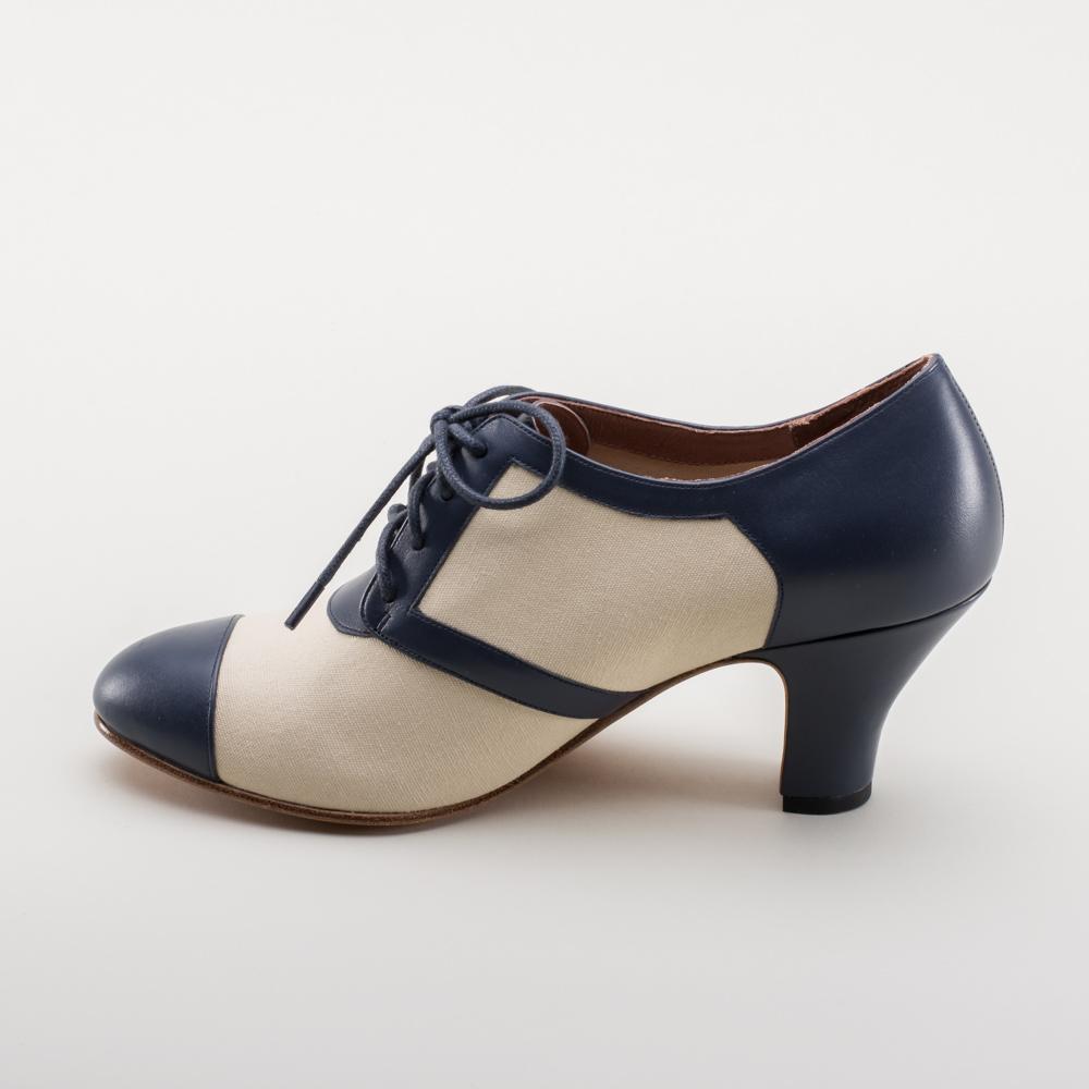 How better to complete a 1920s or 1930s sporty ensemble than with a perfect pair of Evelyn oxfords? These retro spectator oxfords are made of tan canvas combined with a rich brown leather on a 2 3/8" / 6 cm Spanish heel and insole arch support.