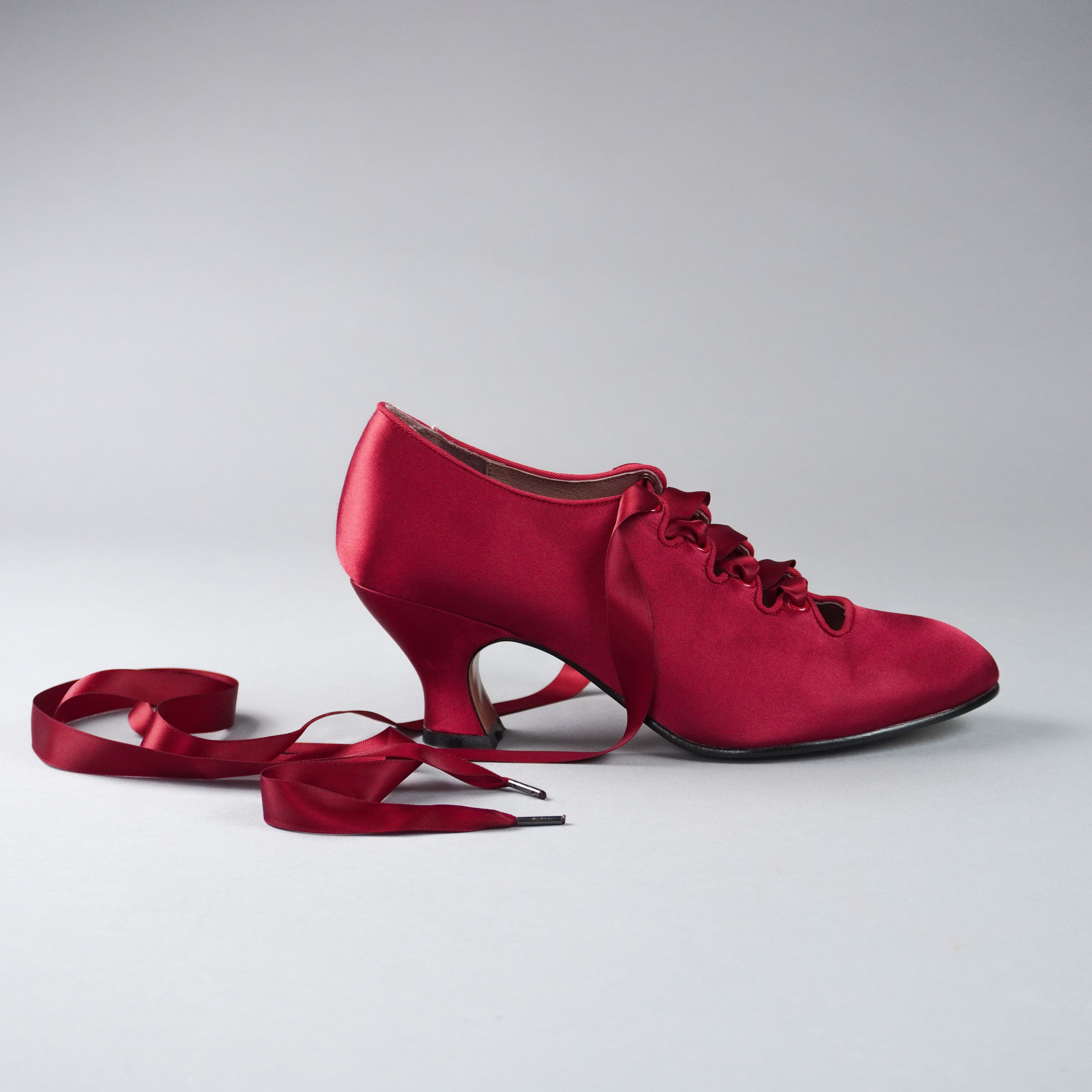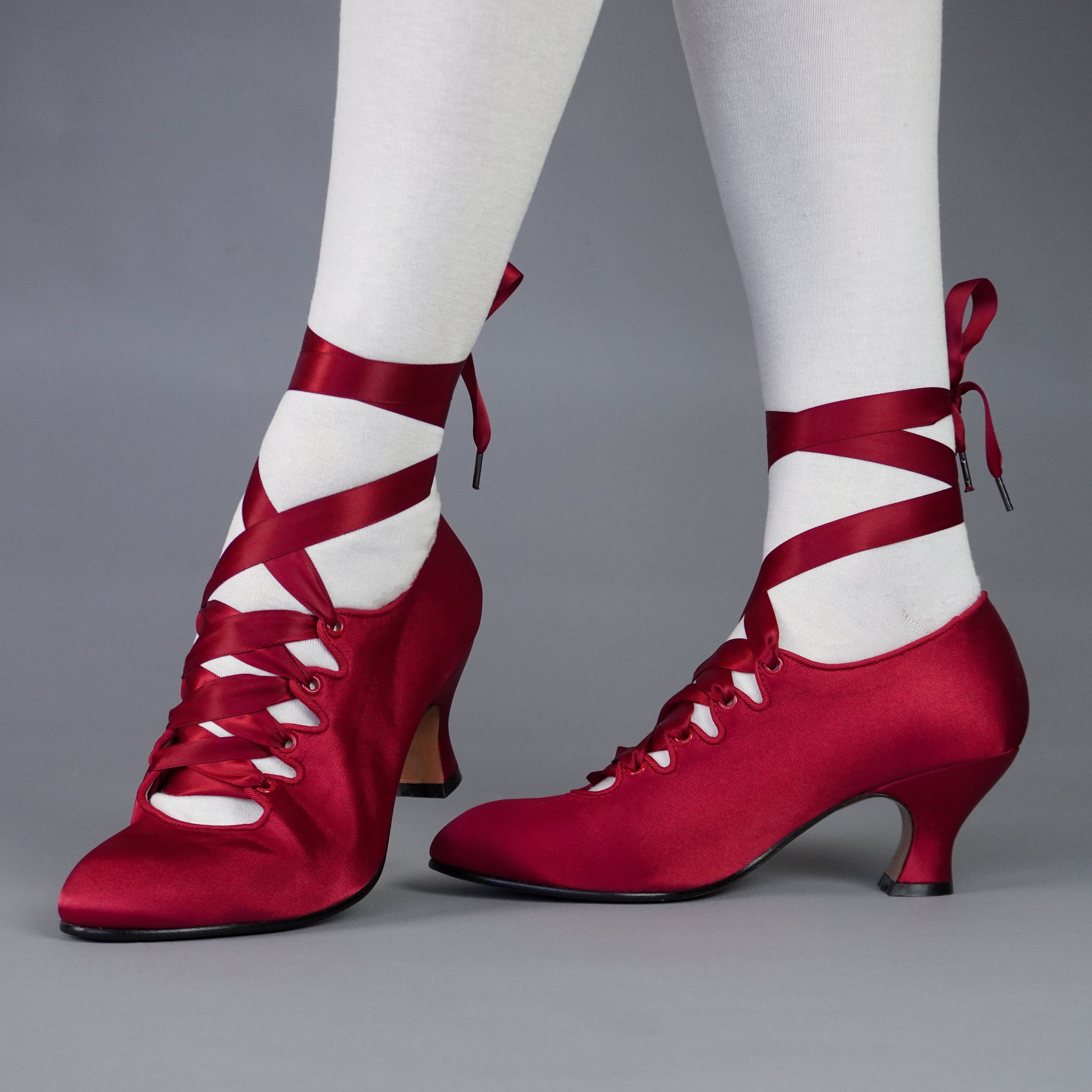 Embody the height of 1910s fashion with these gorgeous Foxtrot pumps! Accurate to 1910 through the 1920s, Foxtrot is based on the oh-so in vogue lace-up shoes of the late Edwardian era. Foxtrot features perfectly balanced, custom 2.5"/6.3 cm French heels, almond-shaped toes, and sleek satin uppers. Serpentine tabs laced with double-faced satin ribbons make this curvy pump one-of-a-kind. Foxtrot comes with two sets of ribbon laces, for adjustable sizing. Wear them with historical costumes, contemporary evening-wear, Lolita coords, or your favorite dress for a touch of glamour.