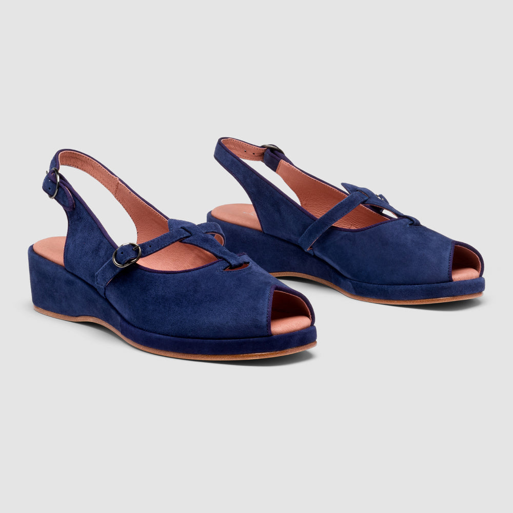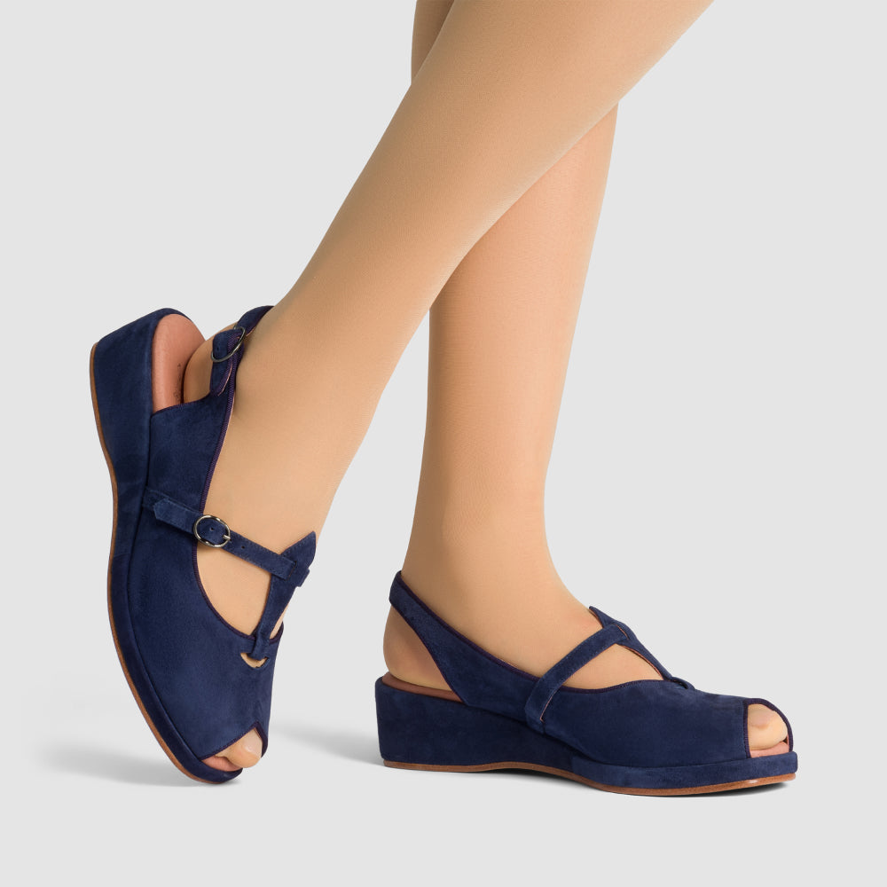 Your search for the perfect slingback sandal is over. Meet Betty, the vintage reproduction sandal that can take you from sand to city, from poolside to the dance floor. Based on an original pair of 1940s sandals from our collection, Betty has just the right amount of coverage for a wear-anywhere sandal. Betty features a brand-new, custom wedge heel that measures 2" in the heel, and a 5/8"/ 1.6 cm platform under the toe box. With a leather lining and smooth leather or suede uppers, Betty will keep you cool and comfortable- and stylish!