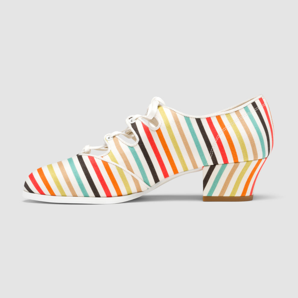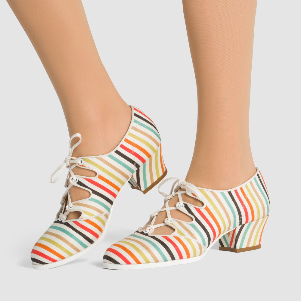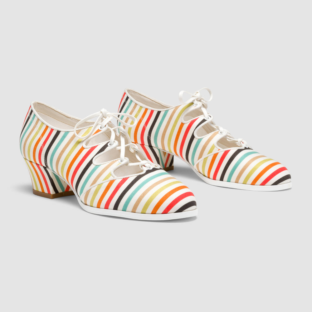 Sporty and sweet, these iconic canvas ghillies are bound to turn heads! Based on original 'ghillie sandals' from the 1930s, Clementine is fresh, festive, and fun. These leather-free shoes have cotton canvas uppers, with a durable rubber sole. Clementine features curvaceous ghillie tabs bound with grosgrain, a comfortable rounded toe, and our widely beloved 1.6"/ 4 cm Cuban heel. Choose from three beautiful solid cotton colorways with complementary bindings, or try the fabulously festive multi-colored stripe for an iconic vintage resort aesthetic!