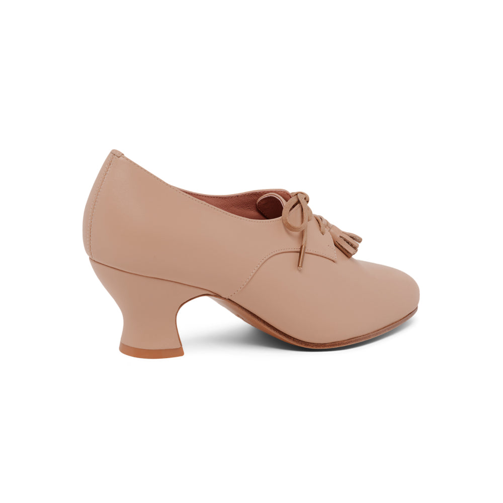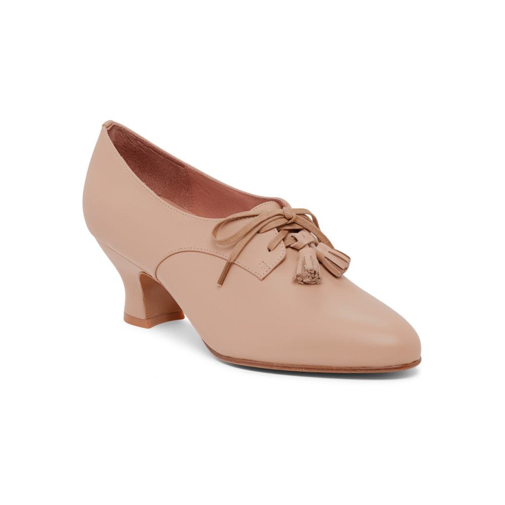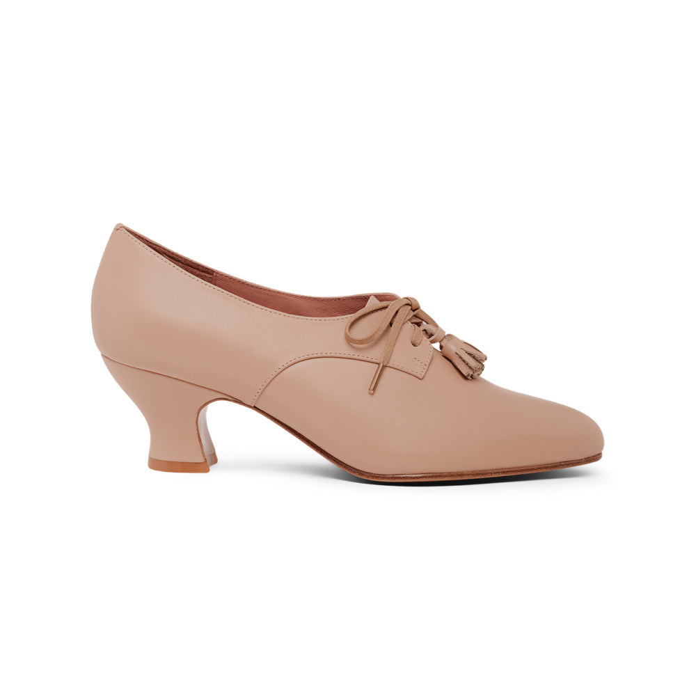 Cordelia is the versatile and attractive Edwardian Oxford everyone needs in their wardrobe. These beautifully crafted shoes are carefully reproduced from period originals, and feature a historical silhouette, lace-up closures, and removable decorative tassels. Cordelia is built on our custom, perfectly balanced, 2"/5.08 cm French spool heel, so you can walk comfortably in style. Available in a selection of neutral-colored leathers, Cordelia blends seamlessly into the leg line for a sleek and sophisticated look that goes with any ensemble. Cordelia comes in both standard and wide widths.
